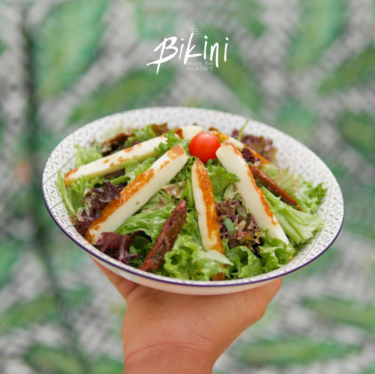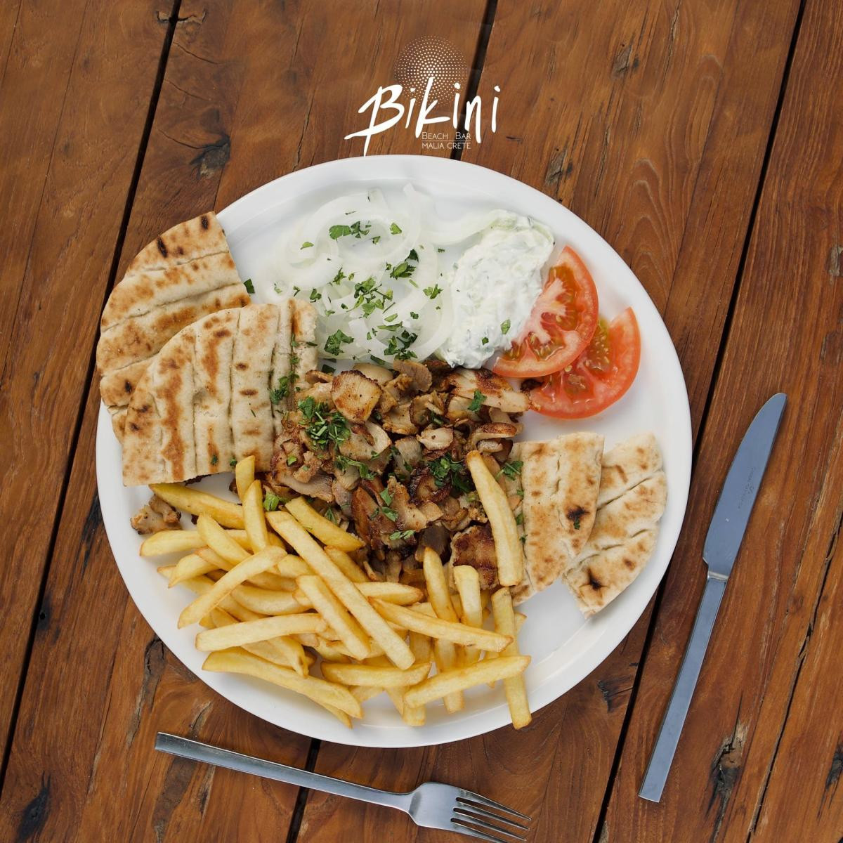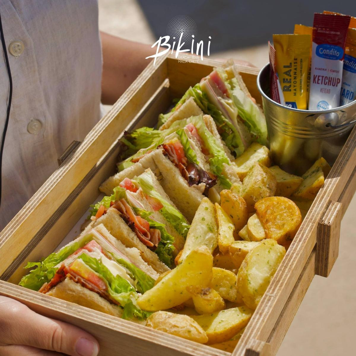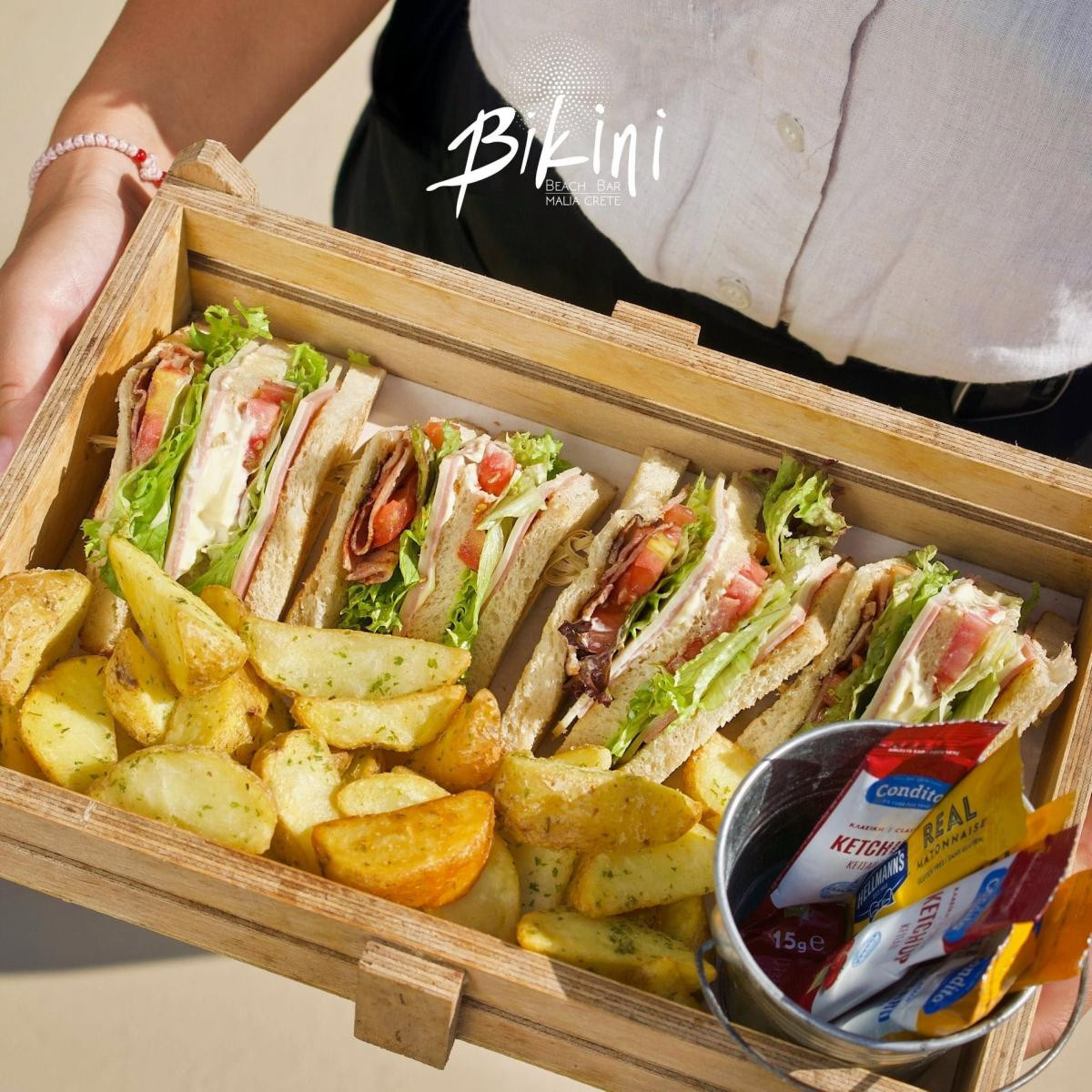 In the menu of Bikini Beach Bar, in Malia, Crete you will find many choices. We will urge you to try the ultimate burger fillet with minced meat, prosciutto, mushroom sauce and pepper sauce and melted brie cheese served on a brioche bun. Served with chips and house dips. All your dishes pair beautifully with a glass of wine from the fully updated list of Bikini Beach Bar, in Malia, Crete.