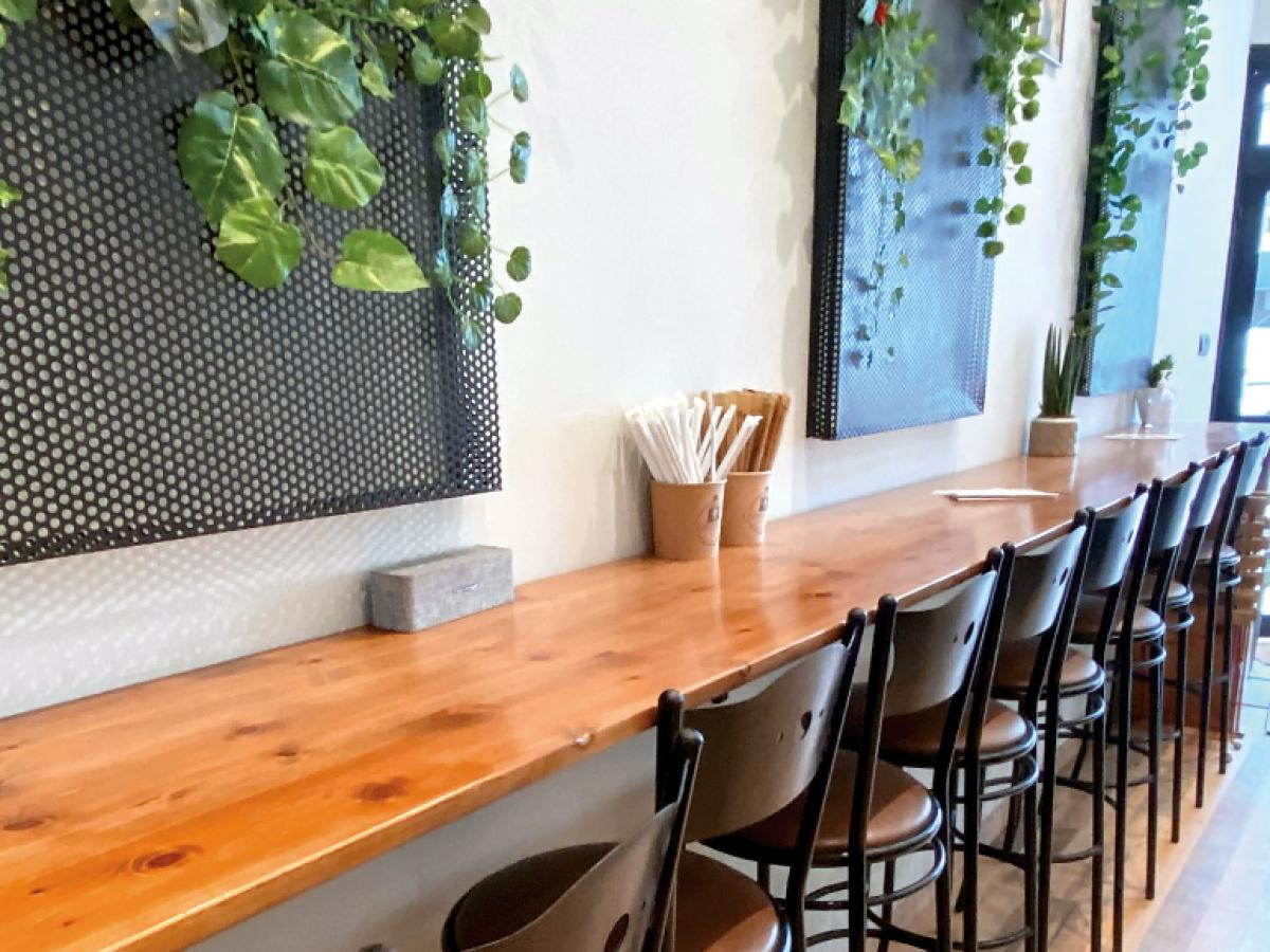 It welcomes you in a simple space with a tall long bar on one side, a few tables high and low without excesses.