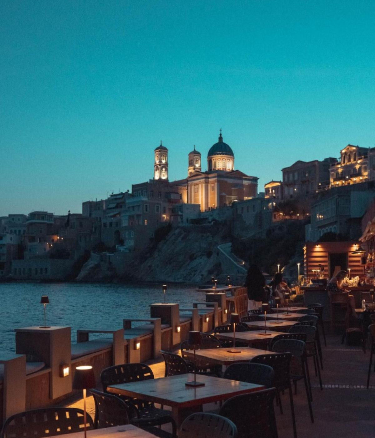 The Ciel restaurant is located in Syros, one of the most picturesque islands of the Cyclades. It is known for its excellent location, offering a beautiful view of the Aegean Sea. Ciel combines elegance with traditional Greek hospitality, creating a warm and welcoming space for guests. The restaurant has a modern and elegant decoration with careful details that highlight the Cycladic aesthetics. The white walls and blue touches create a feeling of coolness and relaxation, while the comfortable seating areas and the careful layout of the space enhance the sense of comfort. Ciel's menu includes a variety of dishes that combine traditional Greek flavors with modern culinary techniques. They use fresh, local ingredients and offer both meat and seafood dishes. There is also a wide variety of options for vegetarians and vegans. The restaurant staff is professional and friendly, always willing to serve and recommend dishes and wines that match guests' preferences. Ciel's location allows guests to enjoy the wonderful sea view, especially during sunset, creating a magical dining experience. The restaurant is centrally located in Syros, making it easily accessible for tourists and locals alike.