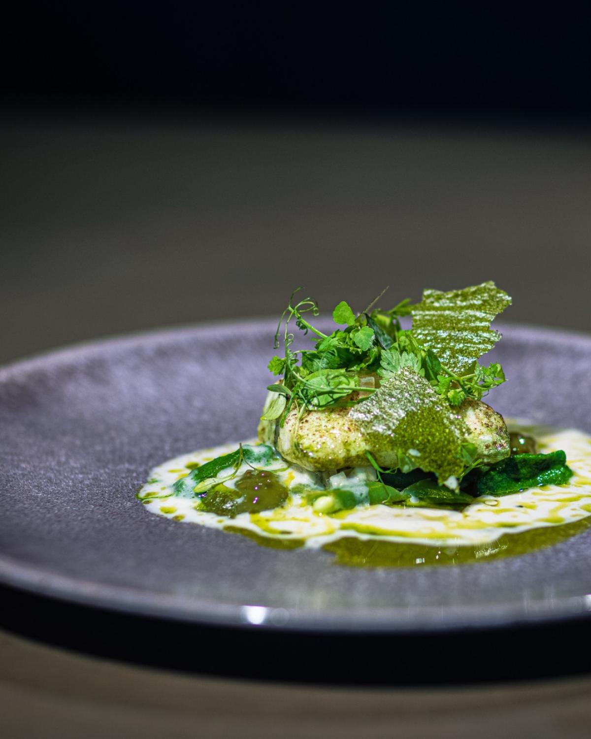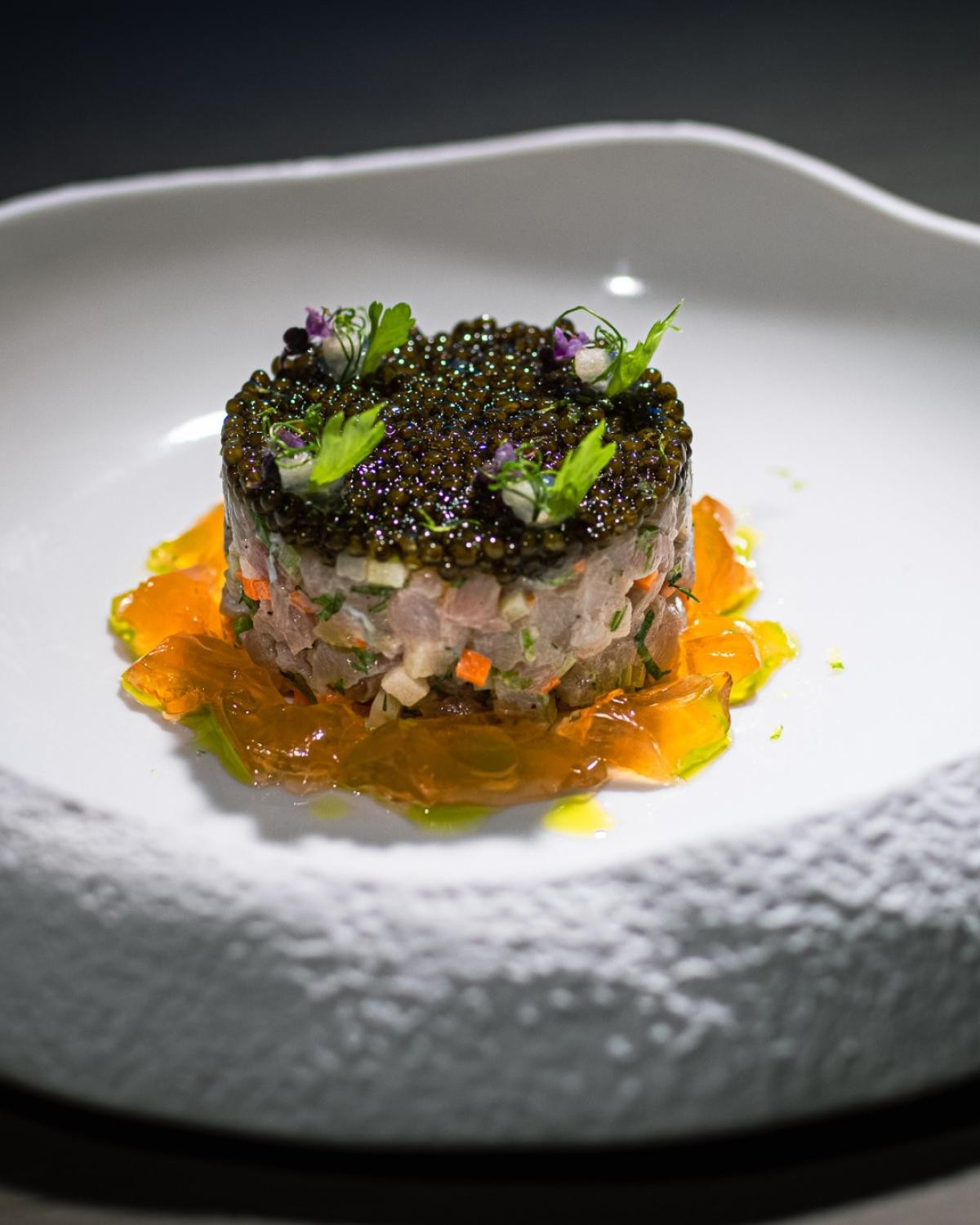 hammerhead with mango, passion fruit, tahini - orange ice cream and fresh