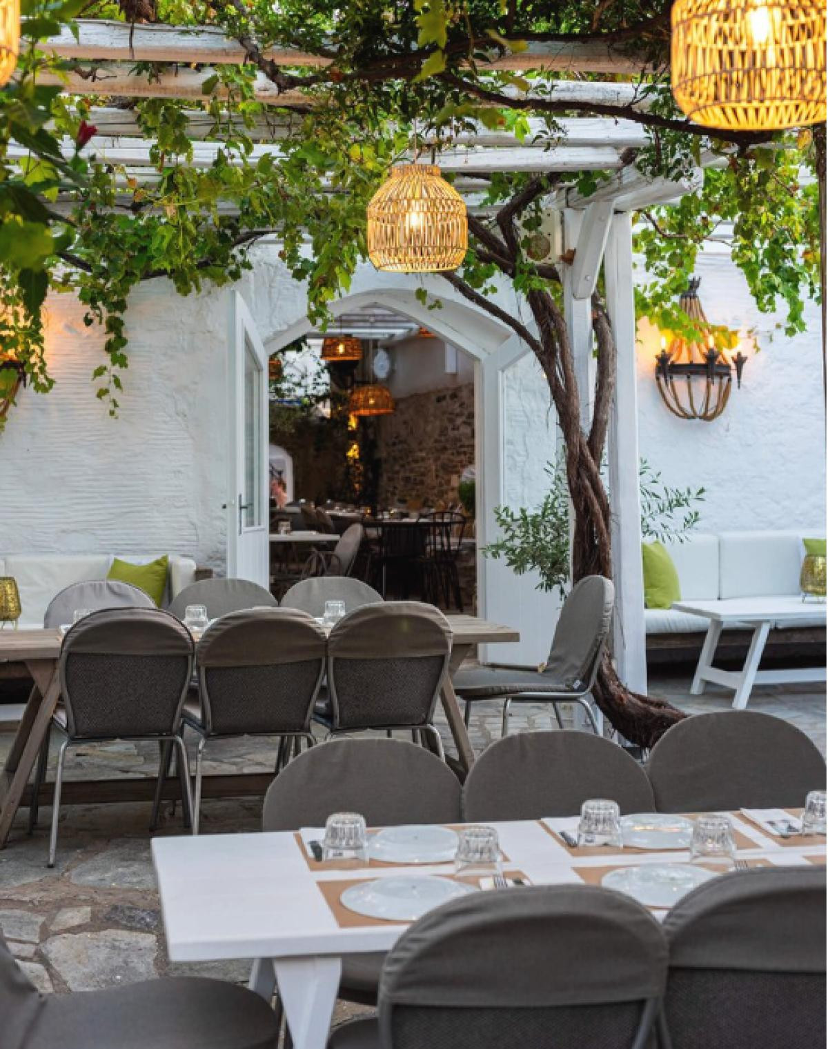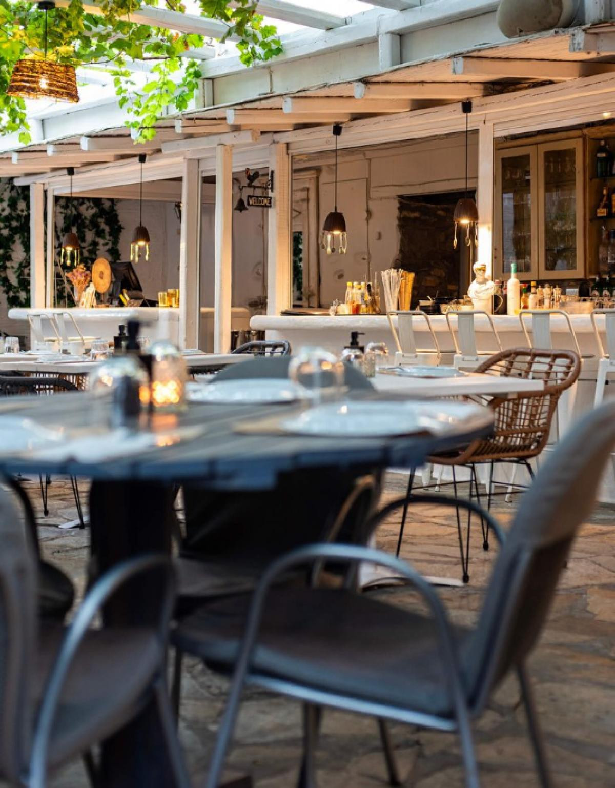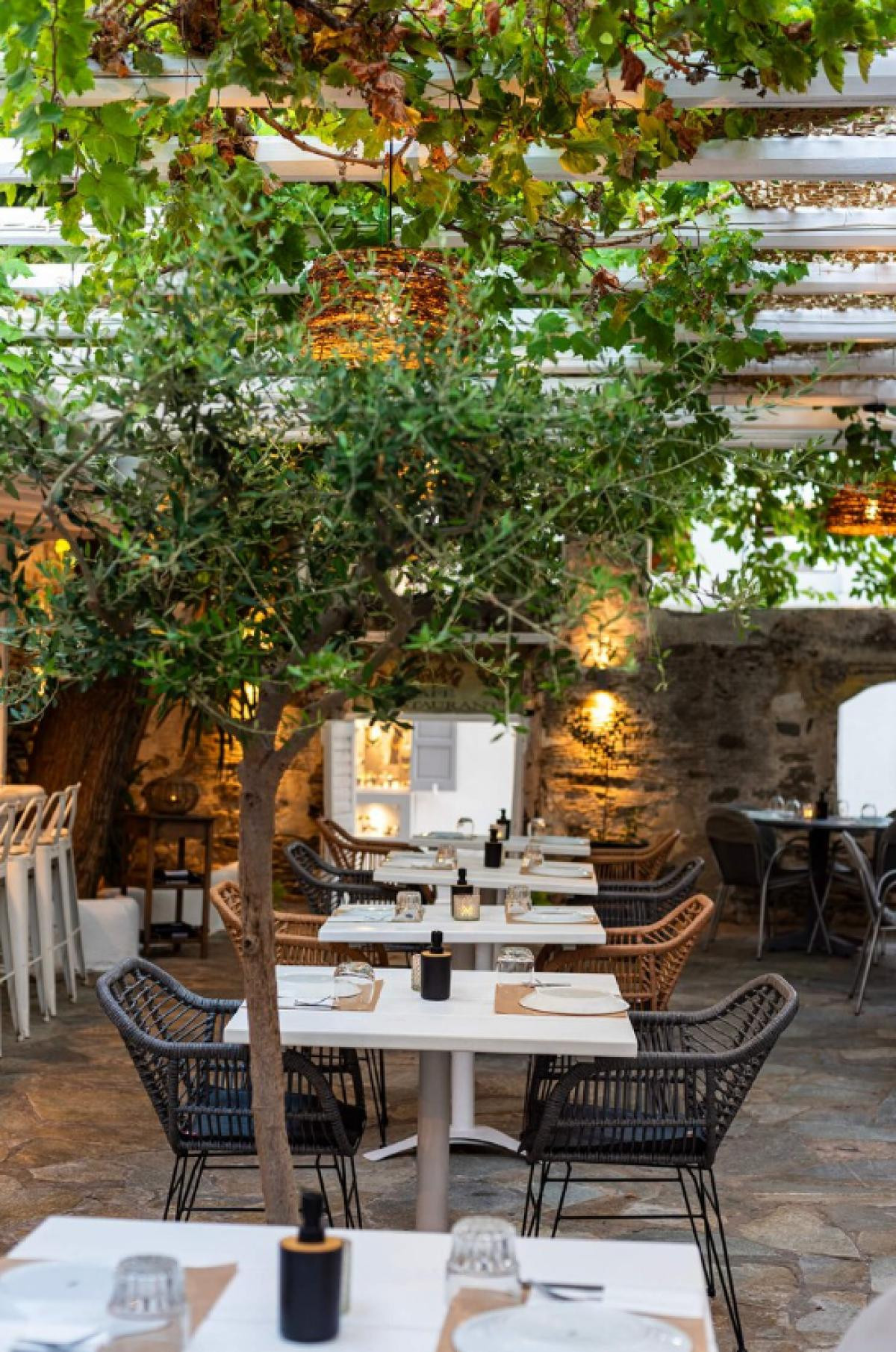 Daphne Restaurant is open-air and shaded throughout the day, its garden offering an unparalleled sensory experience, with tables set under a lush canopy of vines and hibiscus, nestled among olive trees and tropical potted plants. Visit Daphne Restaurant in Parikia, Paros for lunch, dinner accompanied by the restaurant's unique cocktails served in its atmospheric, romantic and unforgettable location.