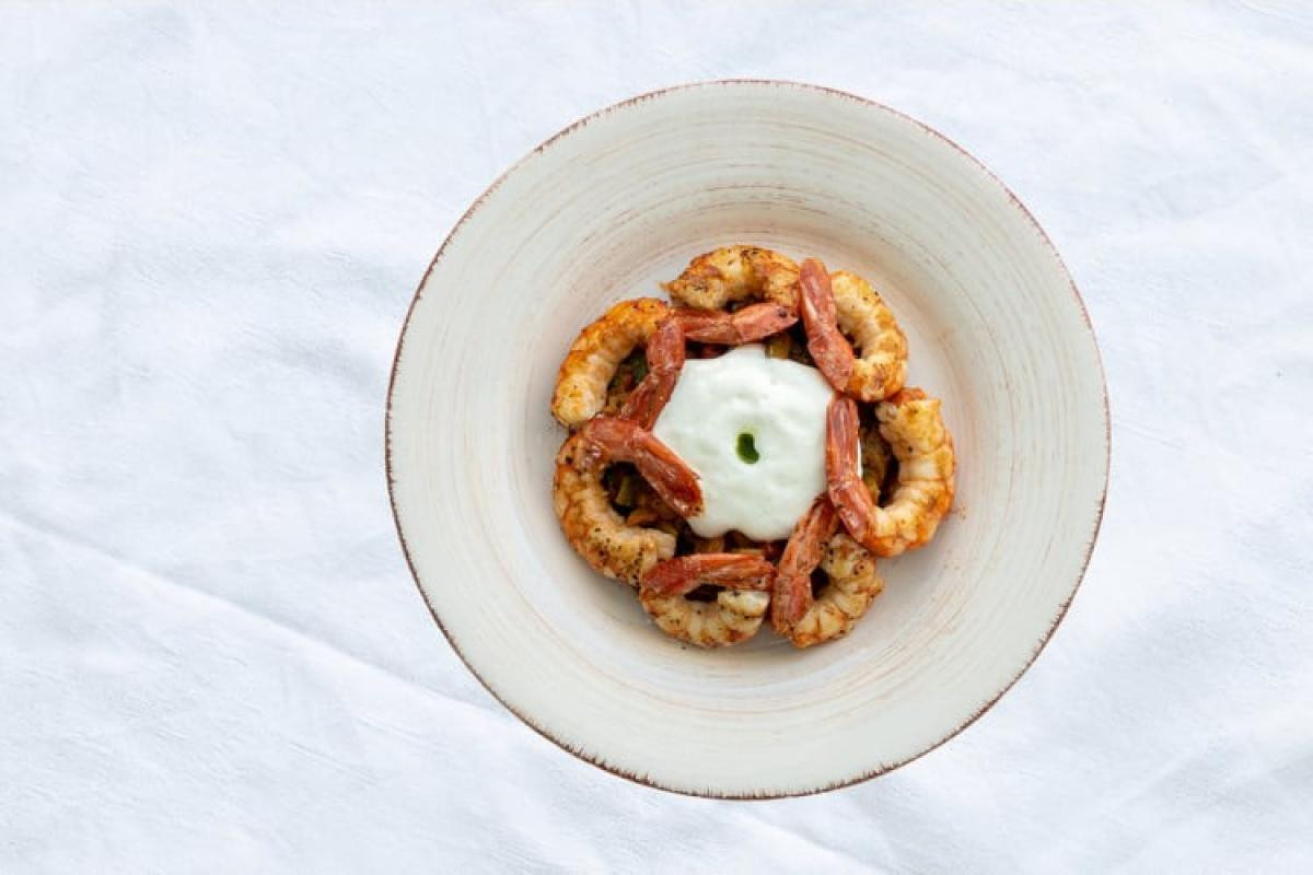 octopus with fava beans, lily, tomato, onion, herbs and pine nuts. Pair all