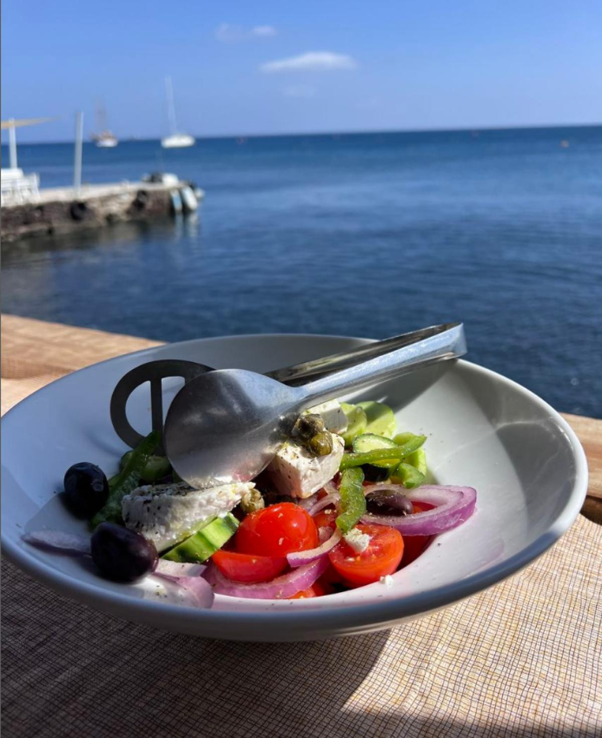 Note: do not follow maps to reach the place, go directly to the far end of the road after the archeological site towards the port (not towards the red beach), and follow the edge of the “beach” on the right, passing 2 others restaurants.