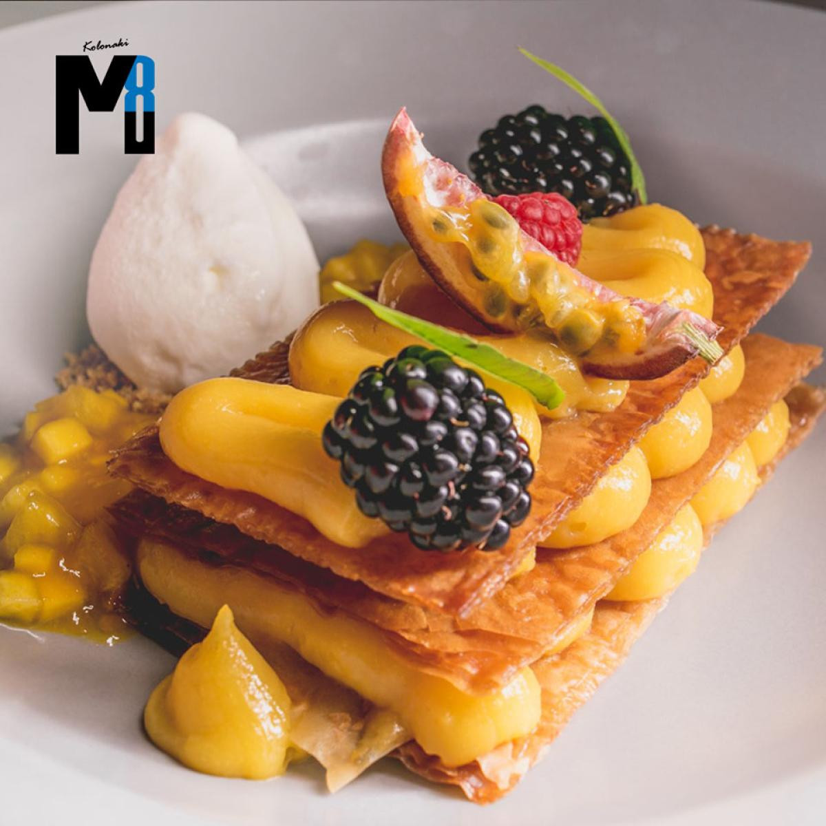 For dessert, restaurant M8 in Kolonaki suggests Baba au rhum with Louisiana cream and raspberry coulis, as well as Oscar sausage with crispy leaf and caramelized nuts with goat's cream, honey and ice cream. Are you still thinking ??? Come today to the paradise of flavors and gastronomic quality at the M8 restaurant in Kolonaki.