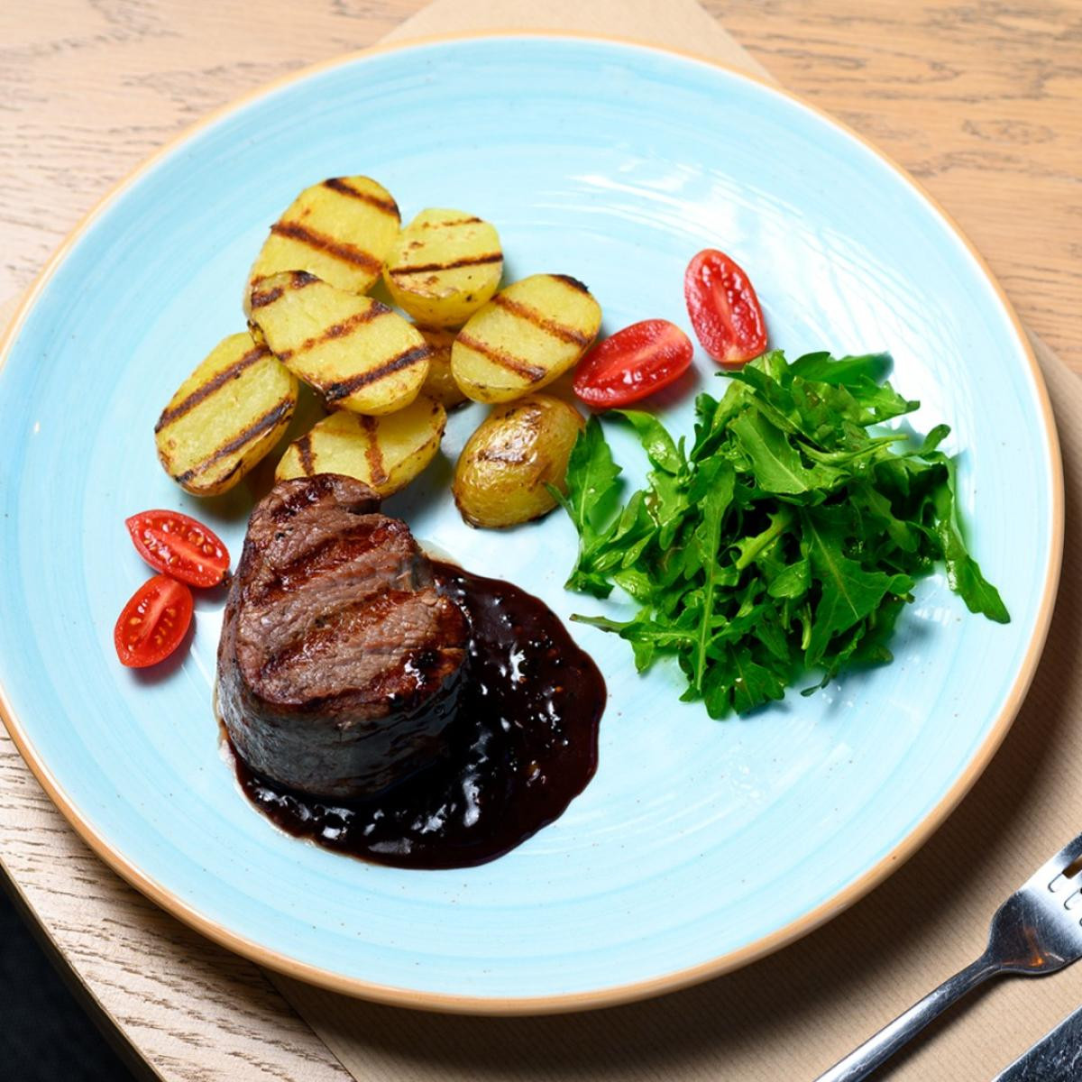 beef fillet, with baby potatoes and pepper sauce, the delicious barley with