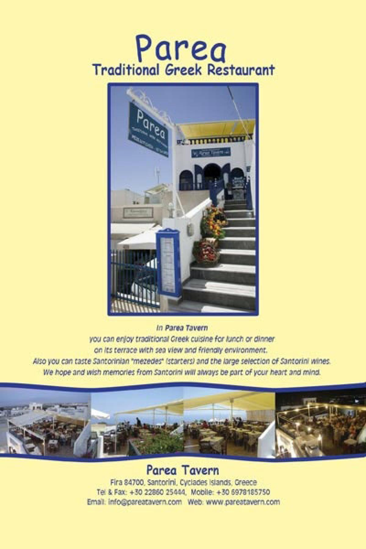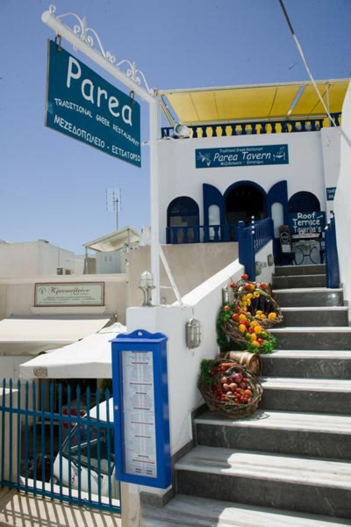 Στο εστιατόριο “Παρέα” μπορείτε να απολαύσετε παραδοσιακή ελληνική κουζίνα σε ένα φιλικό περιβάλλον με άψογο σέρβις και υπέροχη θέα το απέραντο γαλάζιο του Αιγαίου. Μπορείτε επίσης διαλέξετε ανάμεσα σε μια ποικιλία σαντορινιών μεζέδων και να τους συνοδέψετε με ένα μπουκάλι σαντορινιό κρασί από τη κάβα. Ενδεικτικά δοκιμάστε χοιρινή τηγανιά, σουβλάκι κοτόπουλο, καταπληκτικές τυροκροκέτες και τελειώστε με τα απίθανα σπιτικά γλυκά τουςdbo.Restaurantsdbo.Restaurants