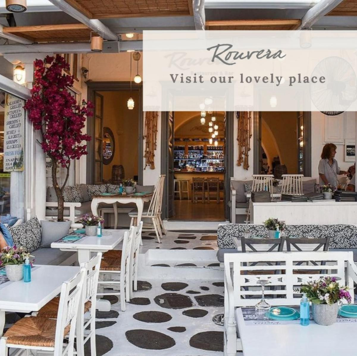 Rouvera is located in Mykonos town , in front of the sea and balances a relaxed environment where you can enjoy your meal with modern touches inspired by traditional Mykonian cuisine. For 20 years Rouvera has been the ideal place for fine dining with delicious vegan dishes, meat and fish dishes and delicious desserts.All Rouvera dishes are made with the tried and tested recipe:love and fresh local products of high quality. Rouvera offers you a nutritious breakfast, casual brunch and ambrosia cocktails at sunset.At Rouvera you are welcomed by its highly attentive and courteous staff ,whose hospitality , creates a safe and intimate environment, with a relaxed atmosphere for a unique dining experience. They are waiting for you at Rouvera in Mykonos town to enjoy your meal....with a Mykonian air.