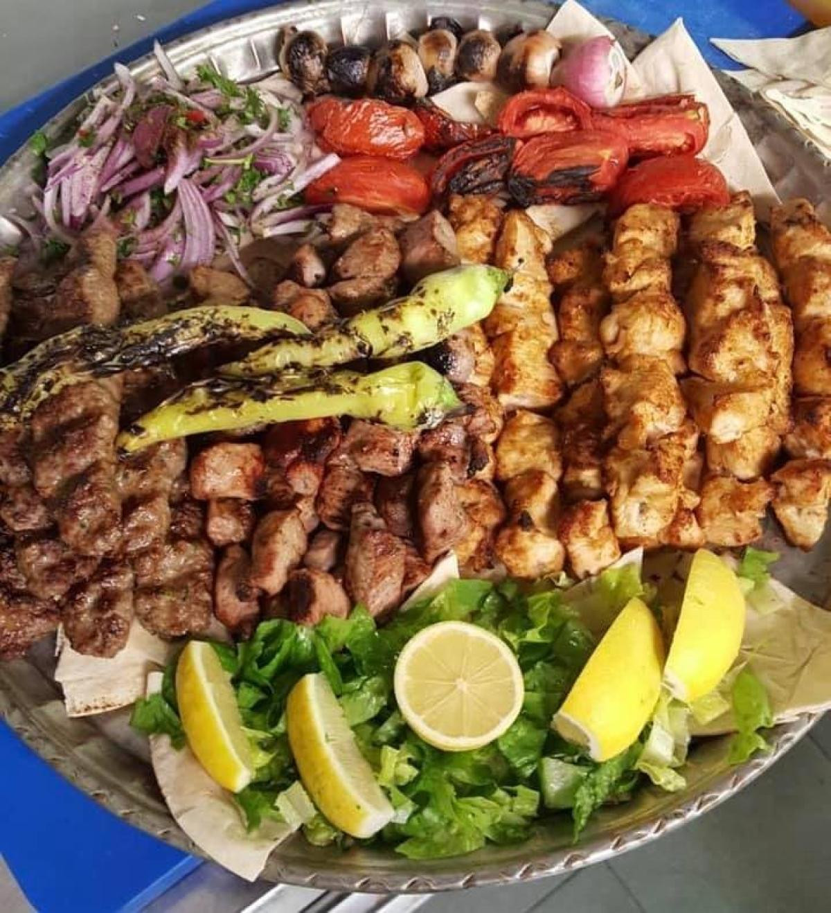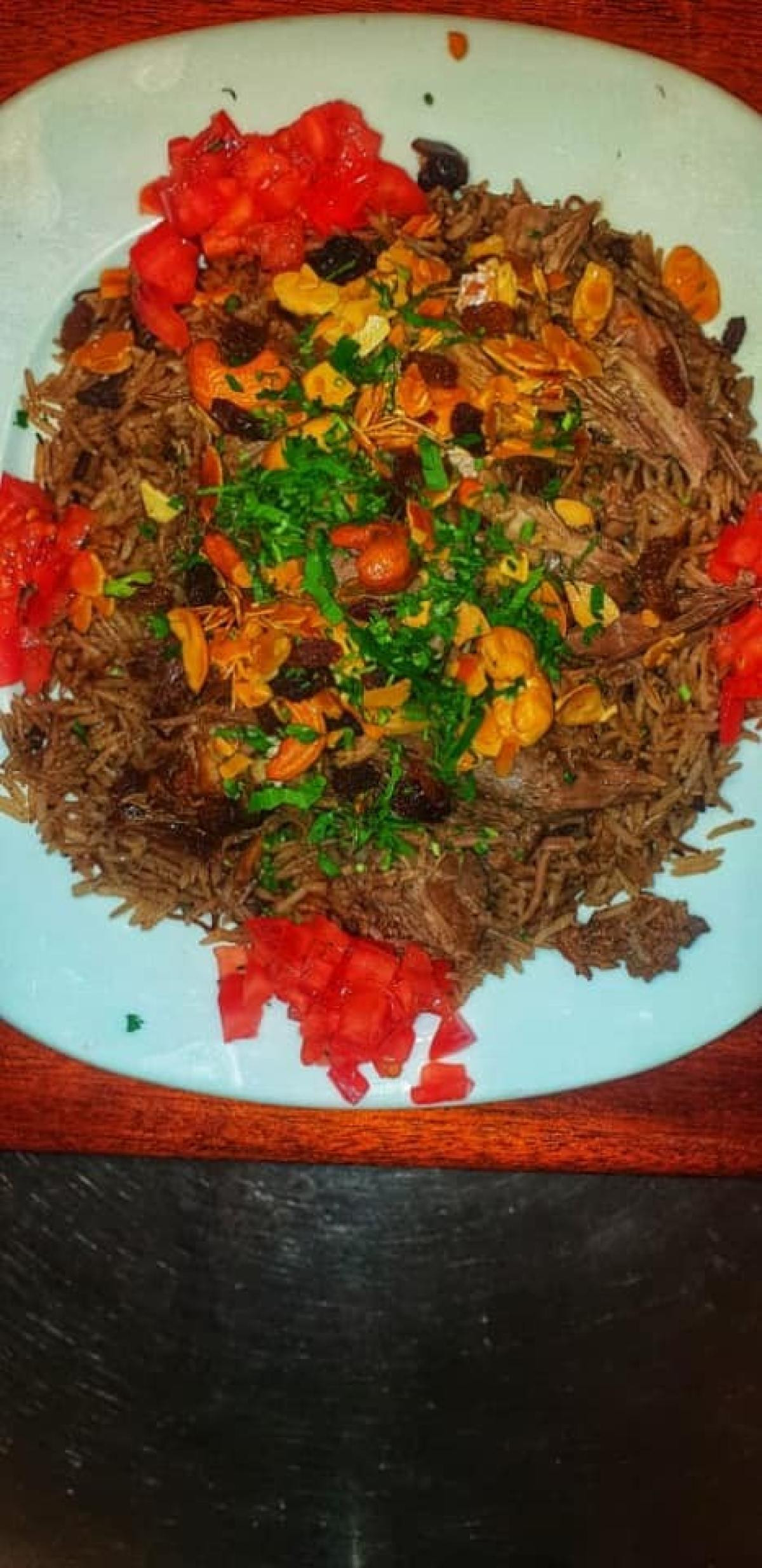 (finely chopped baked lamb), accompanied by Arabic rice, and nuts, and