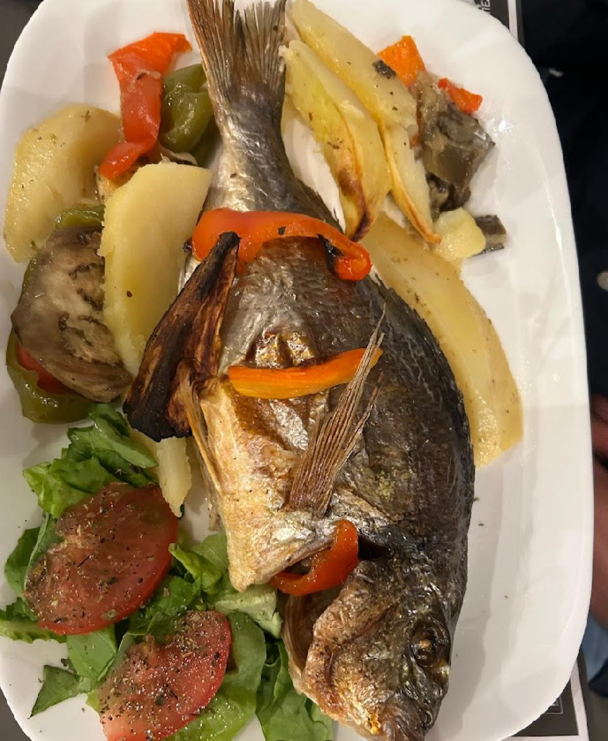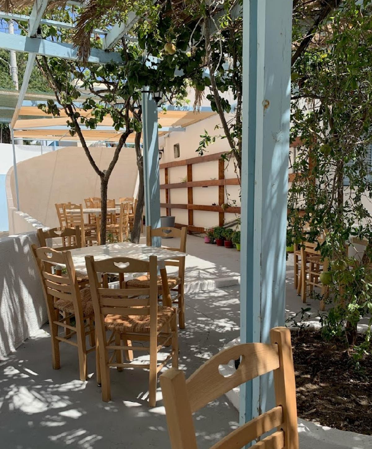 The space is decorated with traditional Cycladic elements, combining the white of the walls with blue and earth tones. The atmosphere is welcoming and relaxing, with romantic lighting at night. The menu includes a wide variety of traditional Greek dishes, such as fresh seafood, moussaka, souvlaki, village salad, and many appetizers.