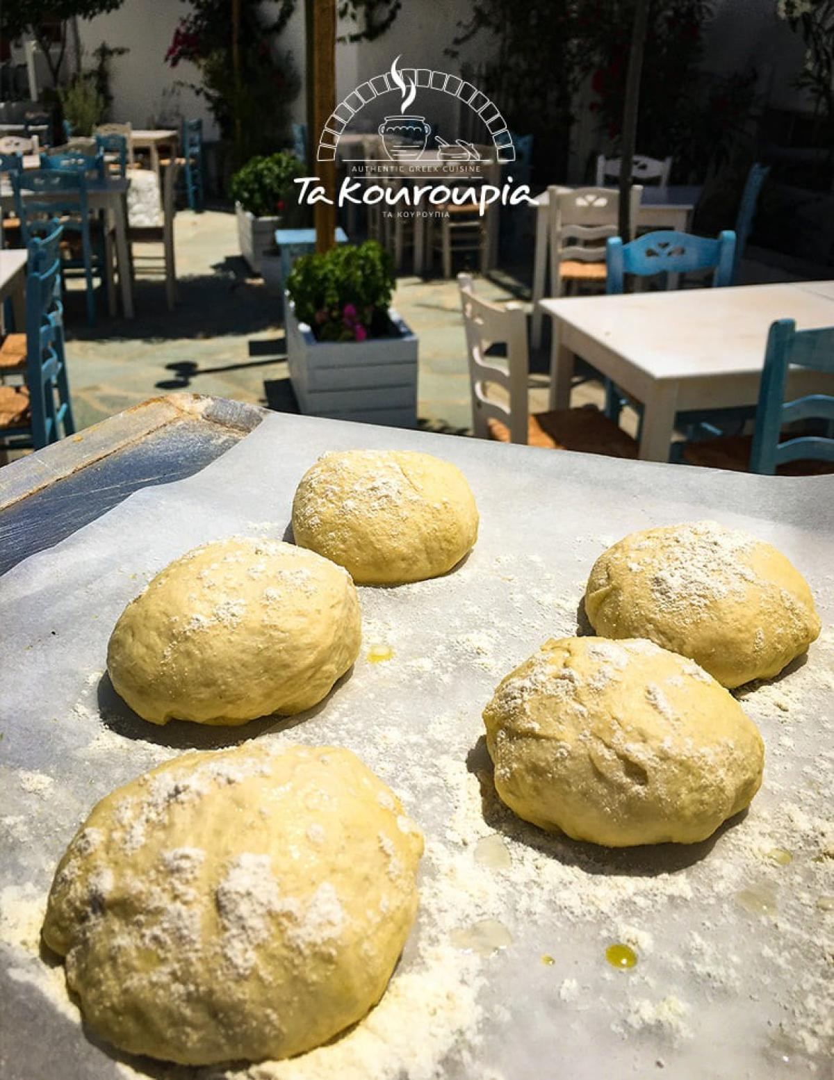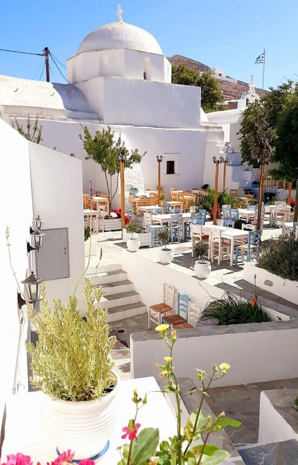 The restaurant Ta Kouroupia, access to the town of Folegandros and through Kontarini Square, and the different dishes that "muse" authentic Greek cuisine. The place of the restaurant Ta Kouroupia, in a Cycladic way, completed in a quiet and idyllic, vectors of different courtyards and tables in a square from the beautiful bougainvillea.