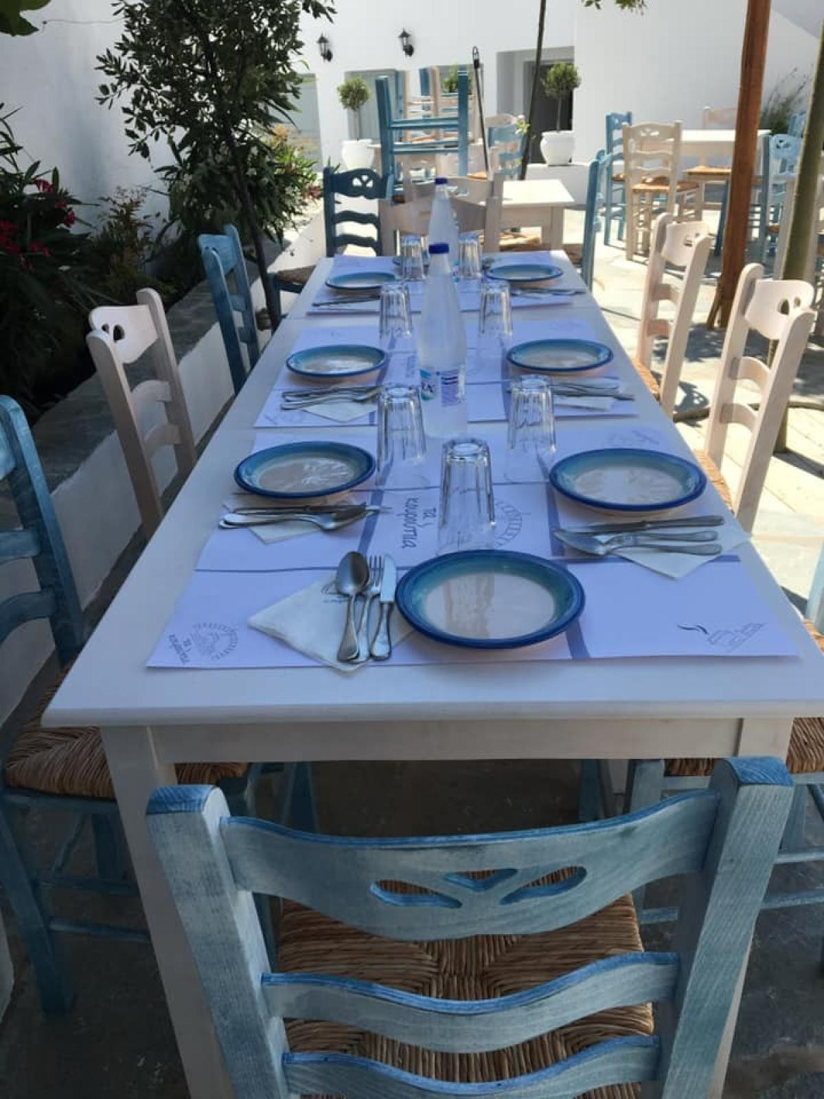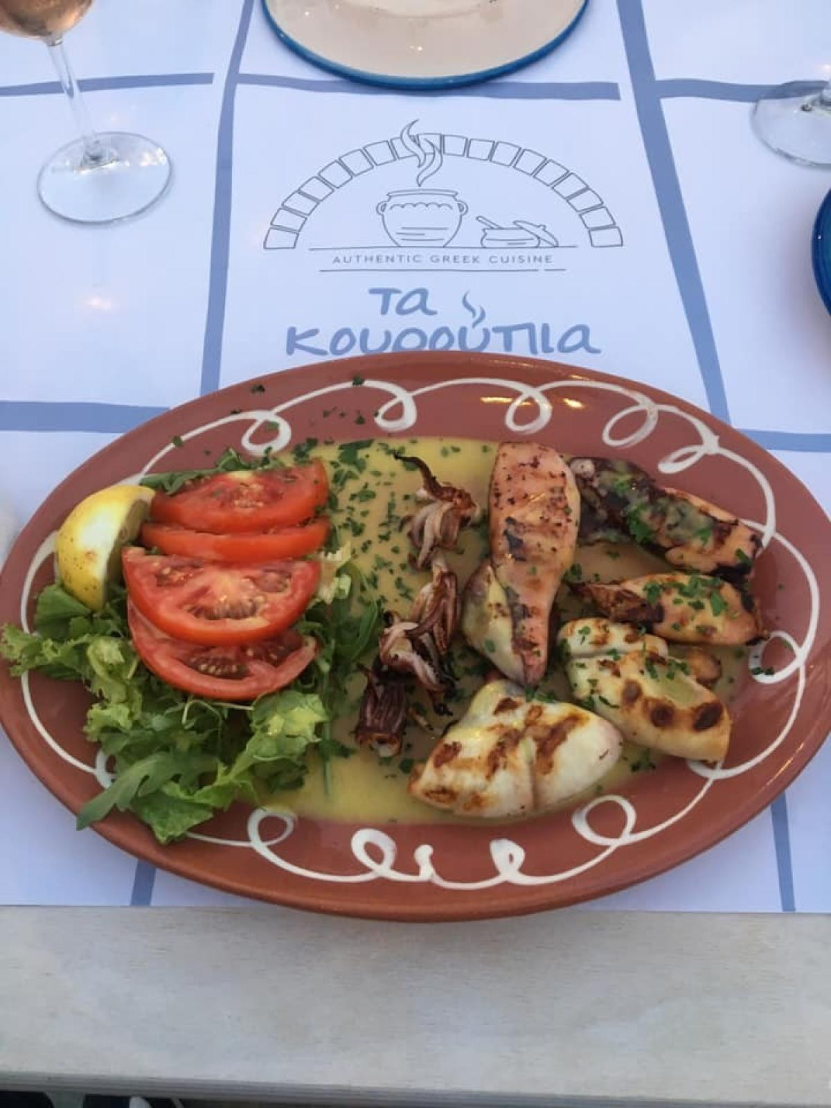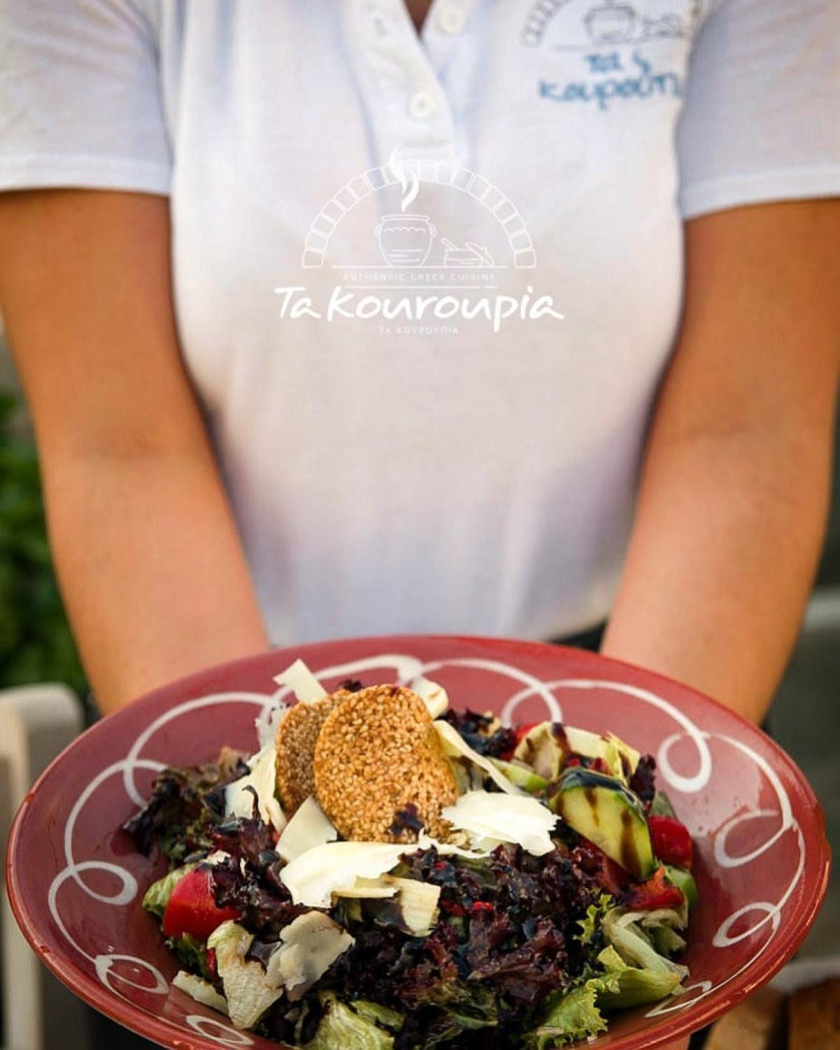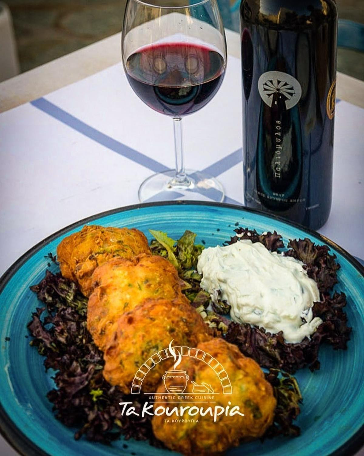 The menu of the restaurant Ta Kouroupia in the town of Folegandros, approaches every customer and individually offers everything! For appetizers "Bouyurdi", diary and grilled feta with boukovo tomato and green pepper. The delicious salad