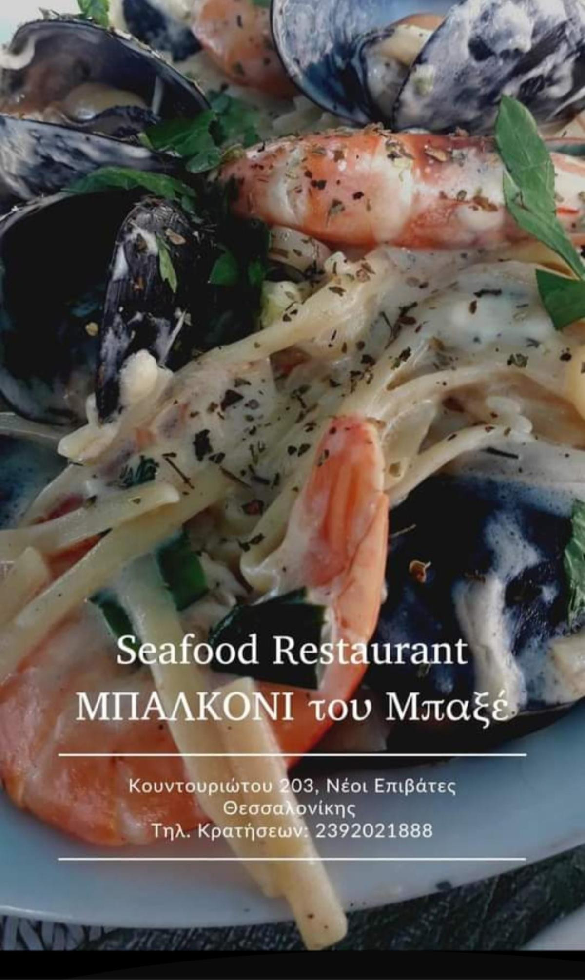 Sea-food restaurant Balconi tou Mpaxe is located in one of the most beautiful spots of the Municipality of Thermaikos, in front of the sea, on the beach of Nea Epivaton, overlooking the endless blue. You are welcomed in a welcoming space with an outdoor area by the sea to enjoy delicious seafood dishes. Try swordfish fillet "Balconi tou Mpaxe" garnished with mushroom sauce & linguini pasta with white sauce, Seafood Salad "Balcony of Baxe" with shrimps, mussels shell, cabbage white & red, lettuce white & red, carrot, spinach, garnished with Oriental sauce, "Balconi tou Mpaxe" mushroom risotto with oyster mushrooms, champignon, portobello, parmesan & white wine, grilled calamari with parsley & rosemary and many other options. You can also accompany your meal with a glass of wine from the extensive list of Balconi tou Mpaxe.