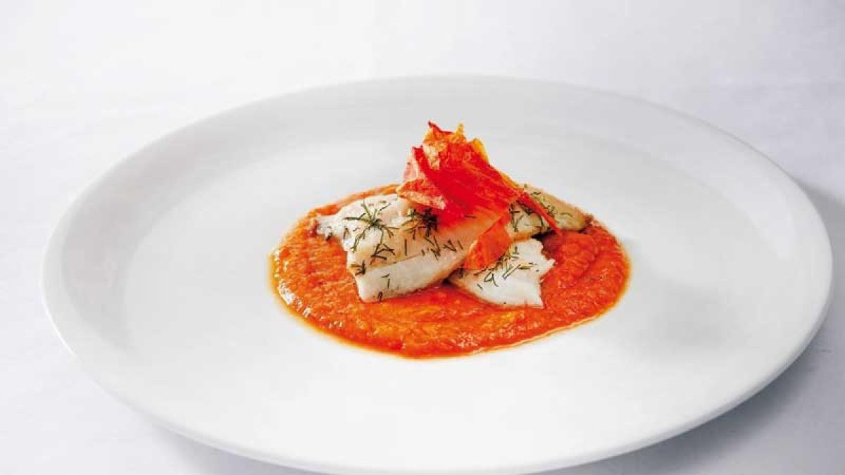 με πουρέ καπνιστής μελιτζάνας και σάλτσα demi-glace, το φιλέτο λαβράκι με πουρέ