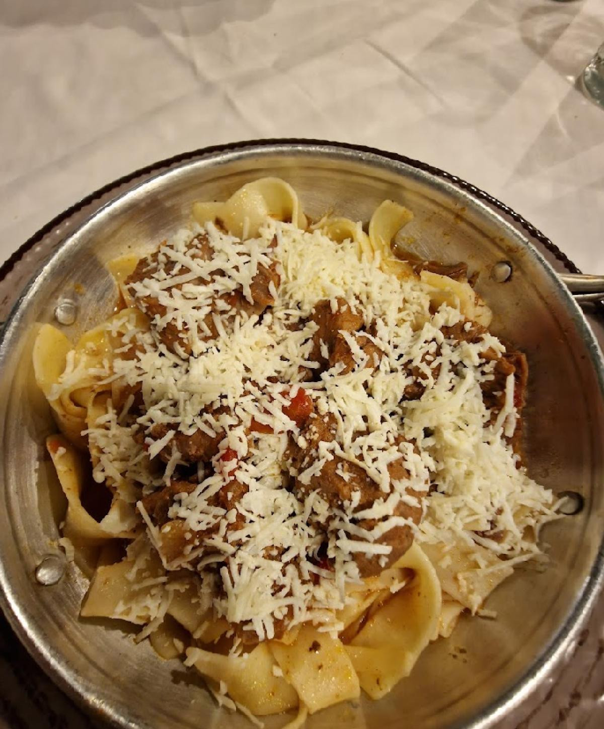 Vi valgte en speciel ret med kødboller i tomatsauce på anbefaling. Velsmagende.