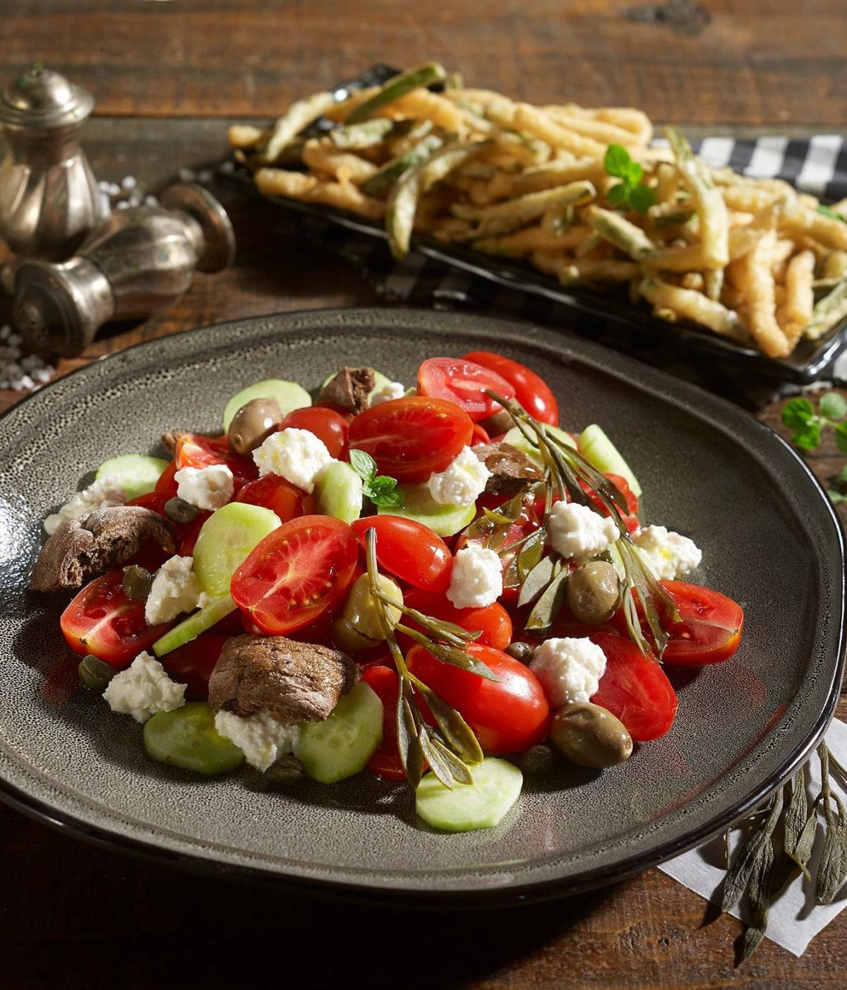 & σως μπαλσάμικο για ορεκτικό. Για σαλάτα επιλέξτε την πολύ δροσιστική ‘’Biftekakia & Souvlakia’’ με πράσινη σαλάτα, ρόκα, ντοματίνια,