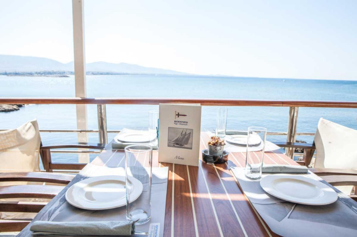Το εστιατόριο Εντευκτήριο ξεχωρίζει επίσης για την αρχιτεκτονική του, που συνδυάζει μοντέρνες πινελιές με ναυτικό στυλ, δημιουργώντας μια χαλαρή και εκλεπτυσμένη αίσθηση, ιδανική για να απολαύσει κανείς την εξαιρετική θέα στη θάλασσα και τα πολυάριθμα σκάφη που περνούν στο λιμάνι.