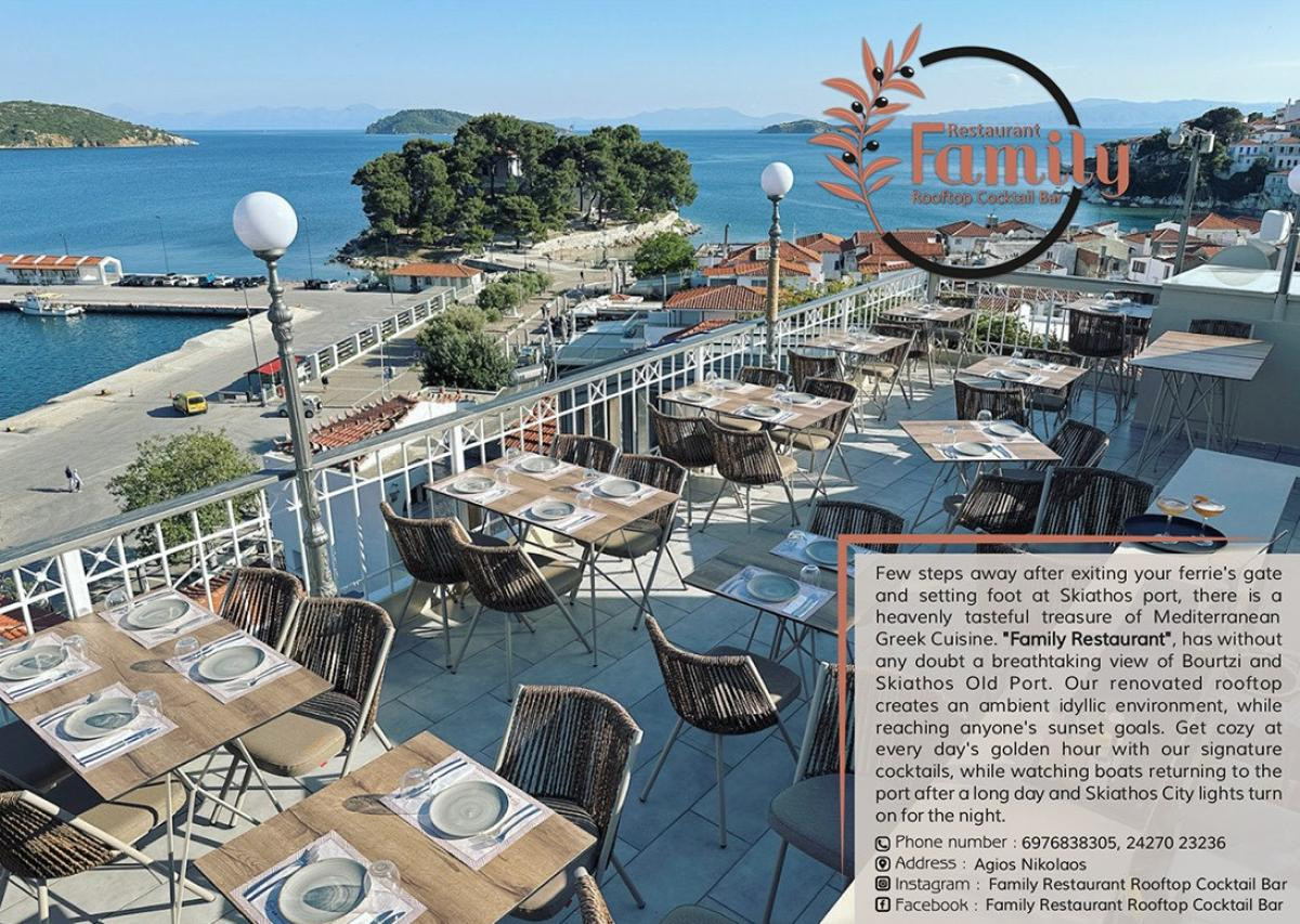 To Family Restaurant βρίσκεται στο όμορφο νησί της Σκιάθου κοντά στον Ιερό Ναό Αγίου Νικολάου .Σας υποδέχονται σε έναν πολύ όμορφο εξωτερικό χώρο με εκπληκτική θέα στην θάλασσα και το γραφικό χωριουδάκι της Σκιάθου. Στο εστιατόριο Family Restaurant Skiathos σας περιμένει το άκρως εξυπηρετικό και ευγενικό προσωπικό , για να σας εξυπηρετήσει καθόλη την παραμονή σας στον χώρο. Μπορείτε να δοκιμάσετε νόστιμα πιάτα παραδοσιακής σύγχρονης ελληνικής κουζίνας, πιάτα φρέσκων θαλασσινών αλλά και φρέσκων ψαρικών , ορεκτικά πιάτα αλλά και δροσερές σαλάτες.Ακόμα μπορείτε να συνοδύσετε το γεύμα σας με ένα ποτήρι κρασί ή ουζάκι για ακόμα μεγαλύτερη απόλαυση του γεύματός σας. Αν βρεθείτε στην Σκιάθο και θέλετε να δοκιμάσετε νόστιμα πιάτα σύγχρονης ελληνικής κουζίνας αλλά και φρέσκα και ποιοτικά πιάτα ,τότε θα πρέπει οπωσδήποτε να επισκεφθείτε το Family Restaurant στην Σκιάθο που σίγουρα θα σαςαφήσει άναυδους.