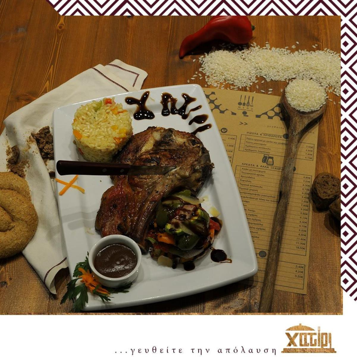 Θα βρείτε το Χατίρι - Μουσικό Φαγοποτείον στην οδό Καγιαμπή 9, στο κέντρο του Ηρακλείου και , λίγο πριν η μουσική σας συνεπάρει, ξεκινήστε την παρέλαση γεύσεων με παραδοσιακά ντολμαδάκια, λαχταριστά μελιτζανοπούρεκα και συνεχίστε με απολαυστικό κρητικό ριζότο με απάκι και τοπική γραβιέρα και μία χορτασικότατη σταβλίσια σπαλομπριζόλα