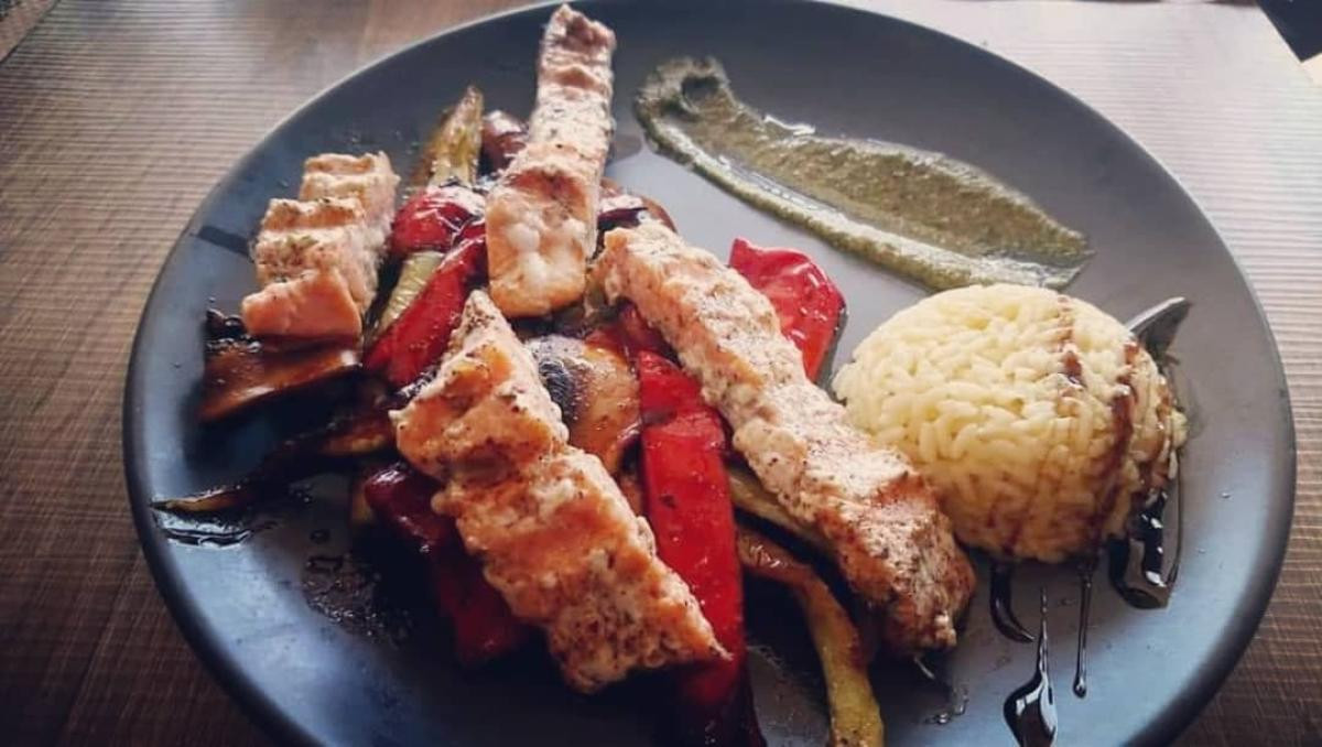 καθώς και τον σολομό στην σχάρα με γρασαρισμένα λαχανικά και σάλτσα κάπαρης.