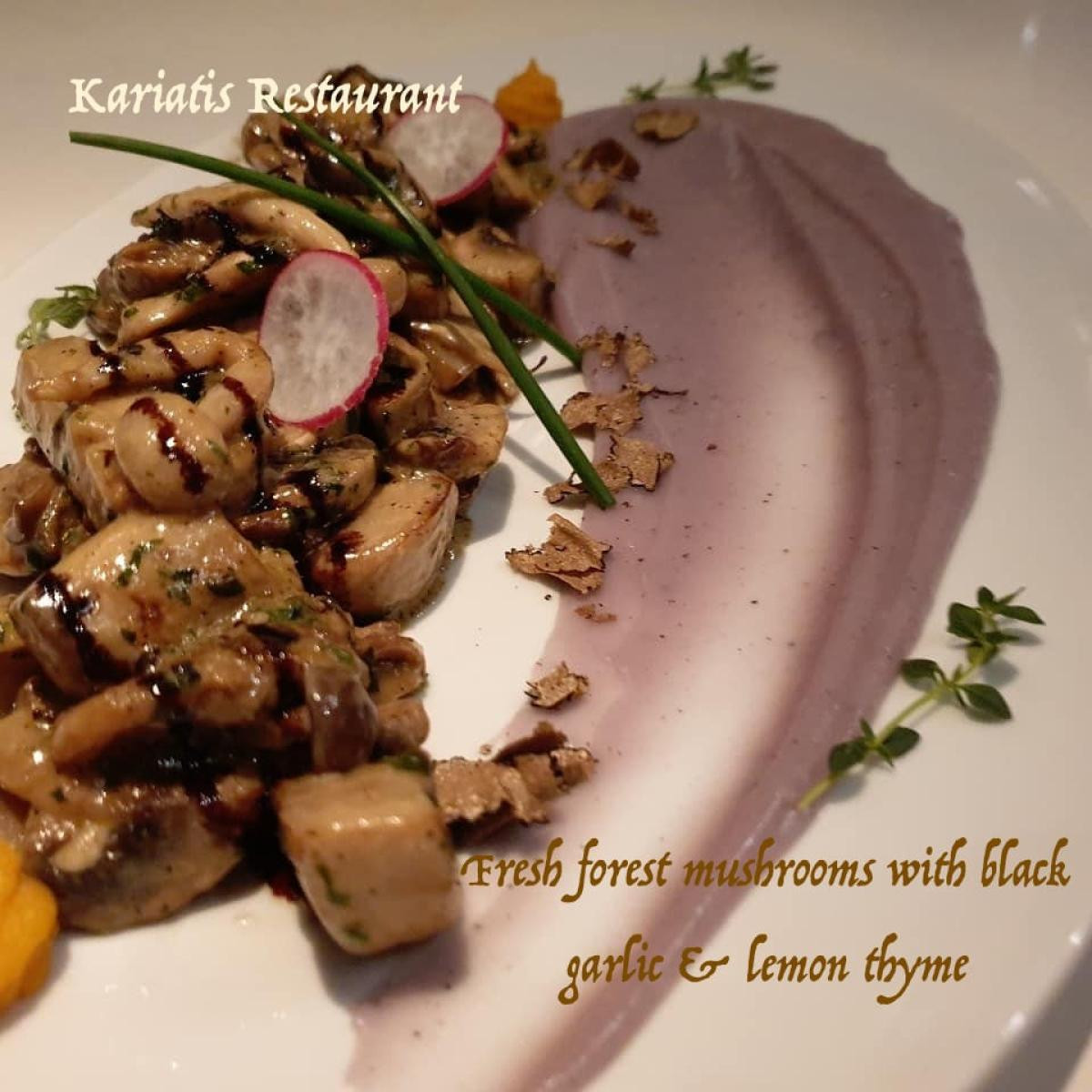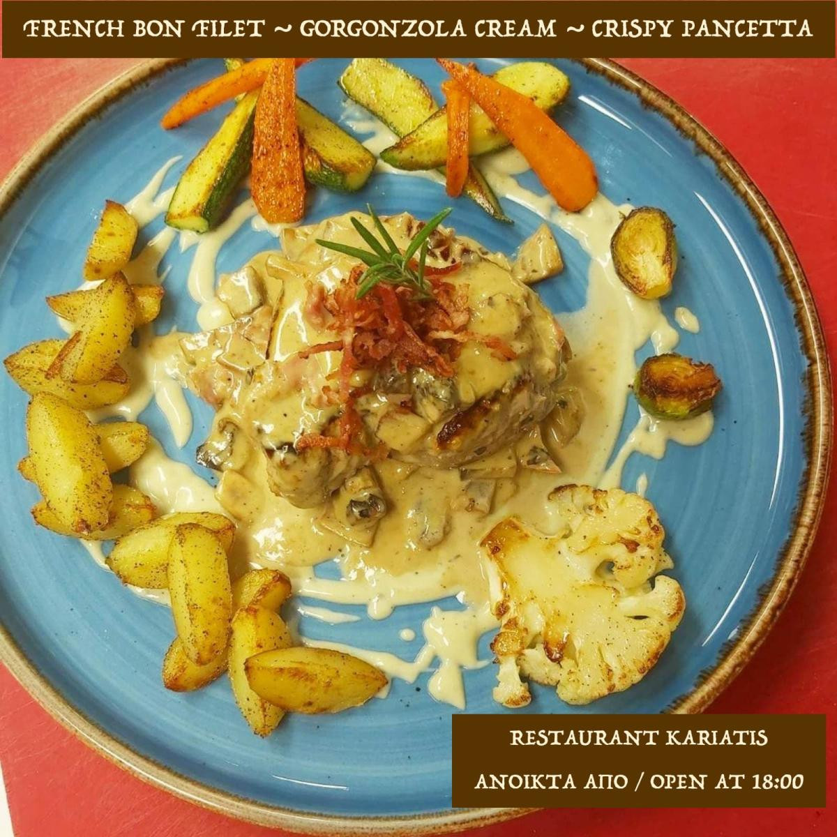 θα σας κάνει να περάσετε πραγματικά εκπληκτικά χαλαρώνοντας στον πανέμορφο του χώρο με την μουσική του εστιατορίου να κινείται σε ρυθμούς jazz αλλά και lounge. Από το 1993 στον χώρο, το εστιατόριο Kariatis ξέρει να ξεχωρίζει και να προσφέρει απλόχερα έντονες γαστρονομικές απολαύσεις ποιοτικής μεσογειακής κουζίνας.