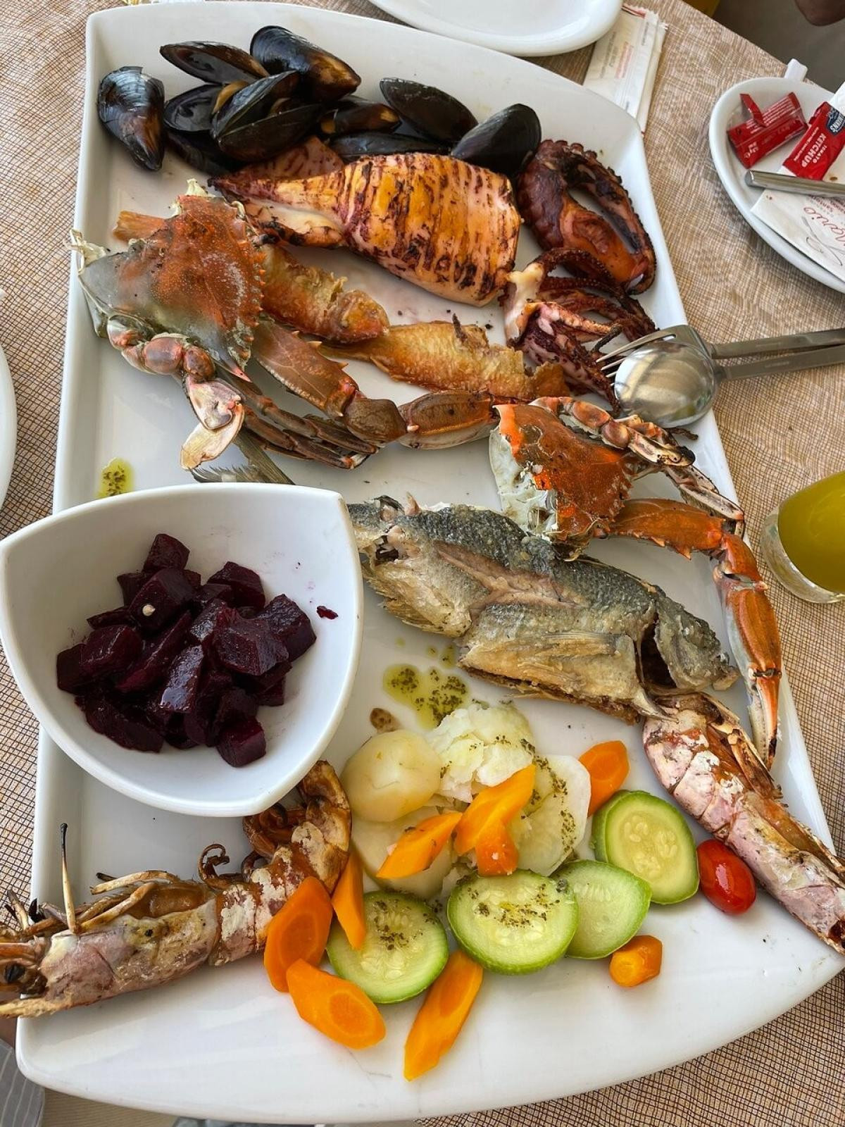 Unlike in other restaurants we’ve been on the island, here the waiter gives us “his show” to recommend food, based on our initial inquiries. I actually didn’t chose per se the fish I was going to eat, although I could have followed the waiter to “select” it amongst the available pieces, but ended up with a red snapper which was delicious. He also didn’t provide a wine list but brought 2 bottles of white wine on the table and made us taste them and chose the one we preferred. Quite unusual practice and may not fit everyone service expectations but although we’re a bit reluctant at first it ended up being and excellent dinner!