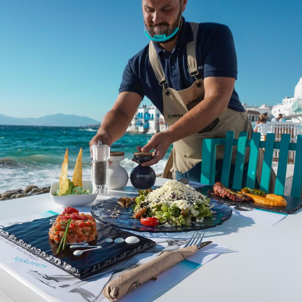 Nice n’ Easy Organic Sea Restaurant στην πλατεία Αλευκάνδρας στην Χώρα της Μυκόνου. Στο πιο γοητευτικό σημείο του νησιού, ένα ακόμη δημιούργημα του Νice n’ Easy Group, βασισμένο στην ίδια φιλοσοφία που διέπει όλα τα εστιατόριά του ομίλου.