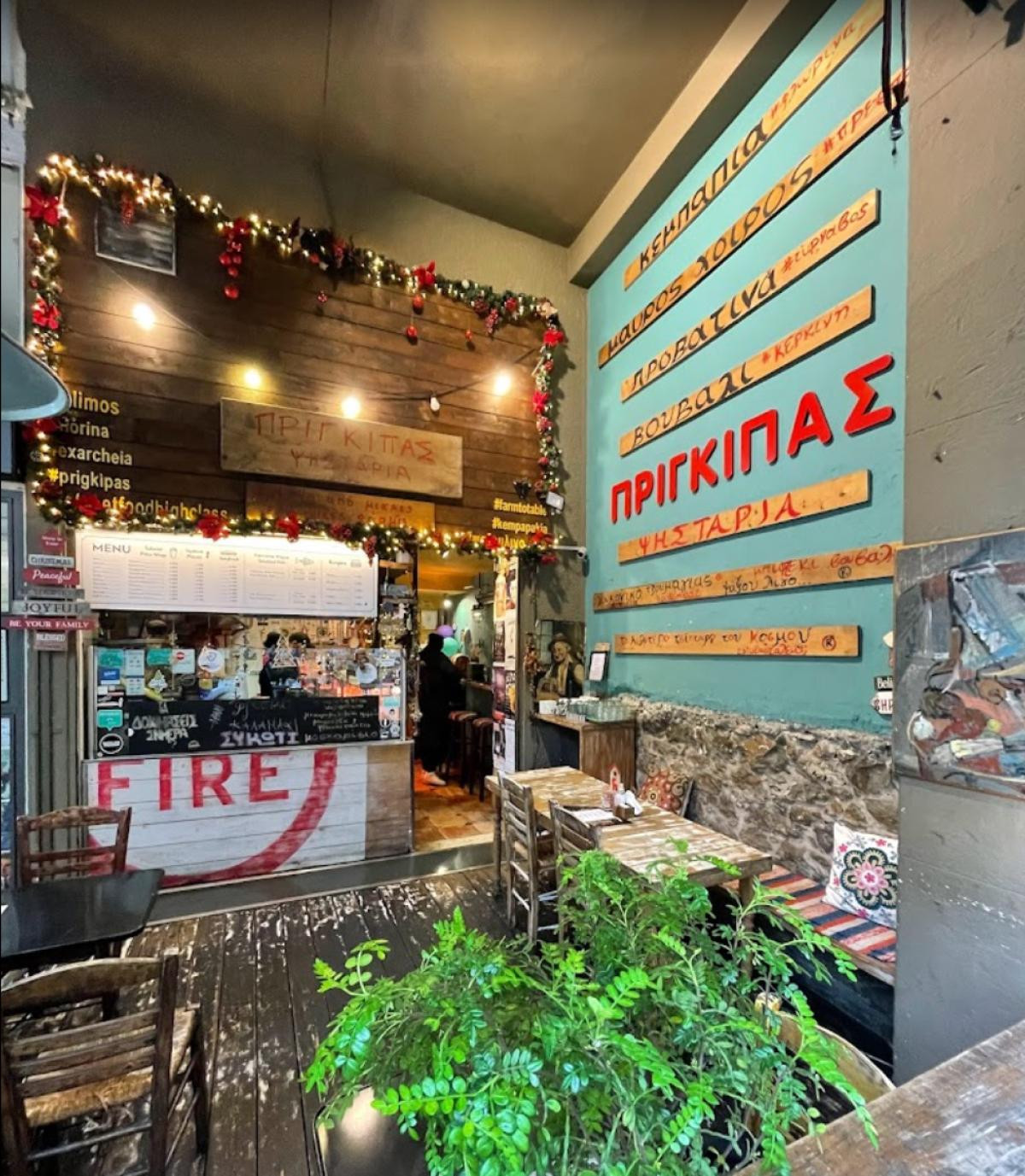 Prigkipas in Exarcheia offers one of the best dining experiences in Athens. Specializing in authentic and unique meats like black pig and beef liver souvlaki, as well as delicious buffalo burgers, this restaurant is a meat lover's paradise. Their green salad with figs is a refreshing starter, and the selection of local organic wines and beers complements the food perfectly. The staff is amazing—friendly, chatty, and always ready with great recommendations. If you’re in Athens, a visit to Prigkipas is a must!