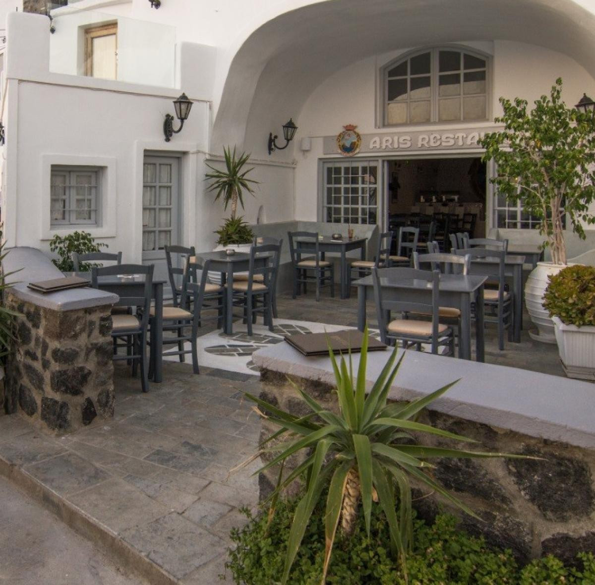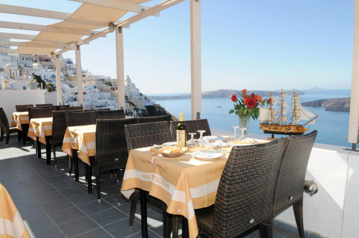 Aris is a wonderful restaurant with very good food, fantastic service and an unbeliebable sunset view and view on the caldera and Fira. We loved it. We always had a table in the first line. But there are only tables in first and second line. Therefore you always have a perfect view.