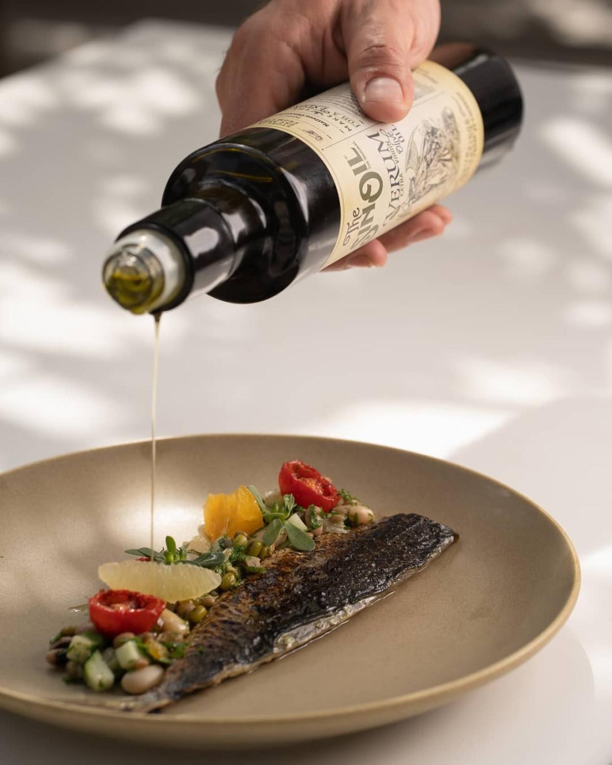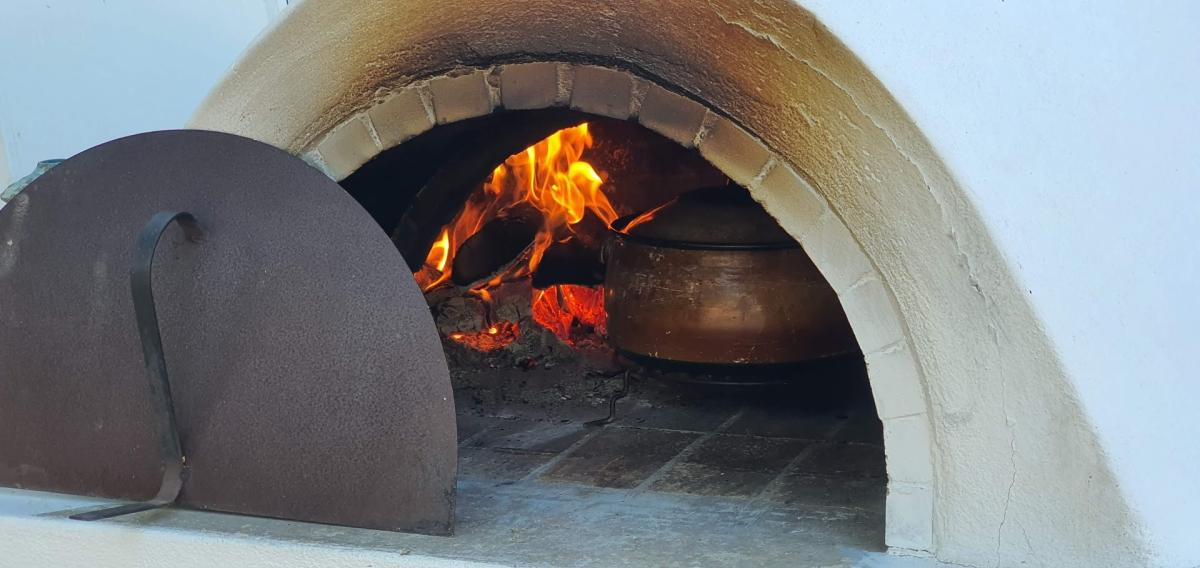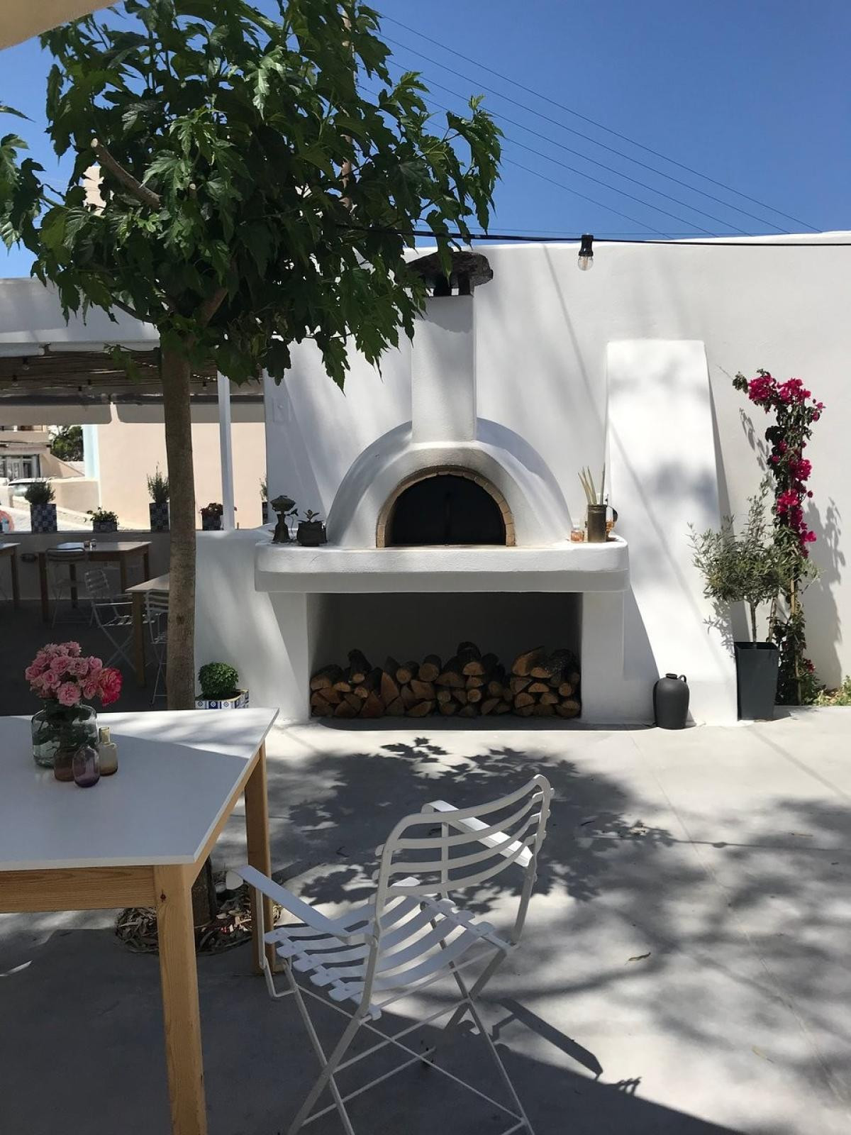 A yard full of bougainvilleas, a wooden pergola and in the background the magic wood oven compose the scene at the Panigyri Festival Food. A beautiful yard in Fira, Santorini, where the famous chef Maikantis Fanis chose to present his proposal of festivals like a lamb potato next to a slow ripening flatbread where on top of it danced lemon hearts salt blossom and freshly ground pepper along with a lamb pate filling our palate with explosions.